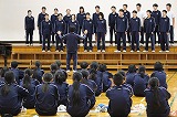 今朝は、体育館で全校集会が開催されました。ステージ上では新三役(会長1名・副会長2名)の任命式が行われ、任命書が授与されました。